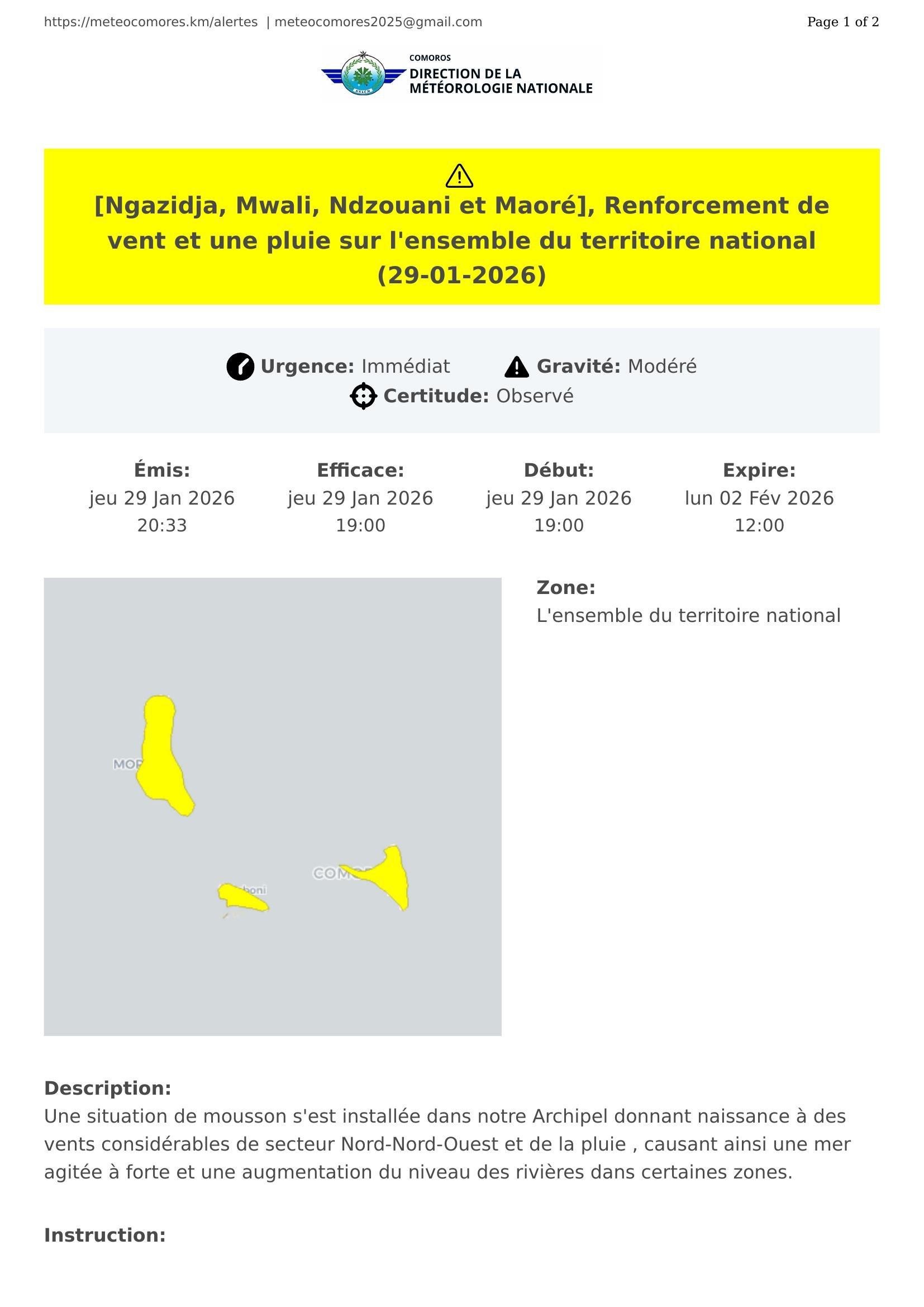 [Ngazidja, Mwali, Ndzouani et Maoré], Renforcement de vent et une pluie sur l'ensemble du territoire national (29-01-2026)