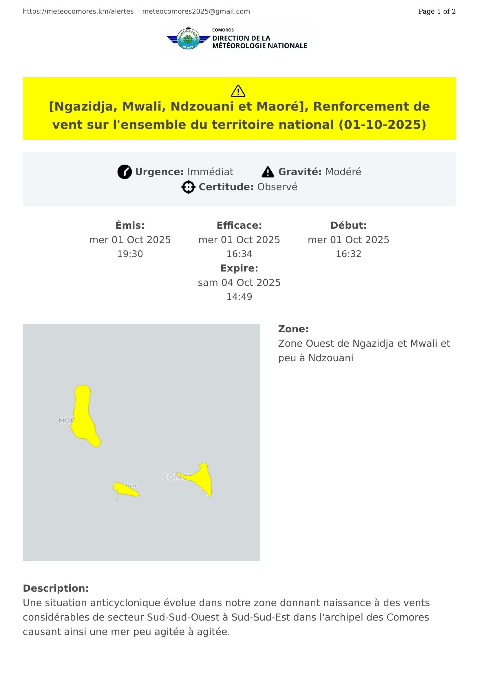 [Ngazidja, Mwali, Ndzouani et Maoré], Renforcement de vent sur l'ensemble du territoire national (01-10-2025)